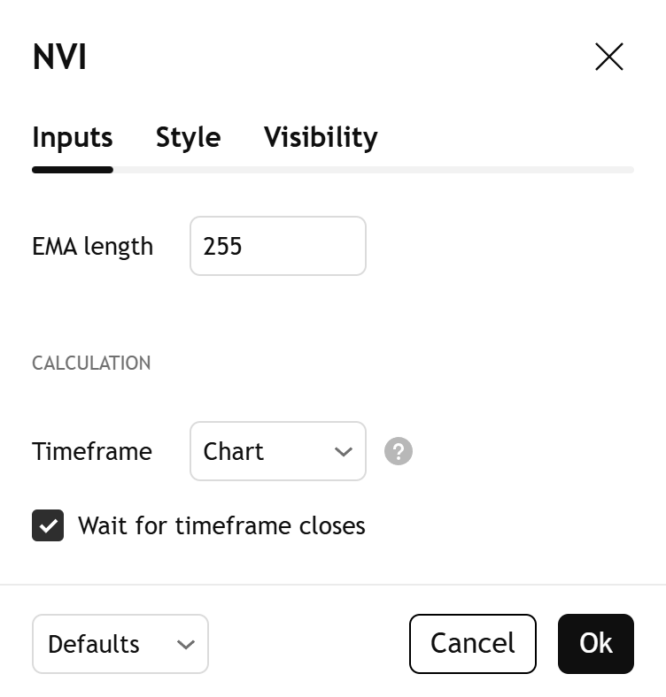 - قم بتعيين القيمة الأولية لـ NVI. تحدد القيمة مقياس NVI، ولكنها لا تؤثر على سلوك المؤشر. القيم الأولية الأكثر شيوعًا هي 1000 و100 و1. يستخدم هذا المؤشر 1000.