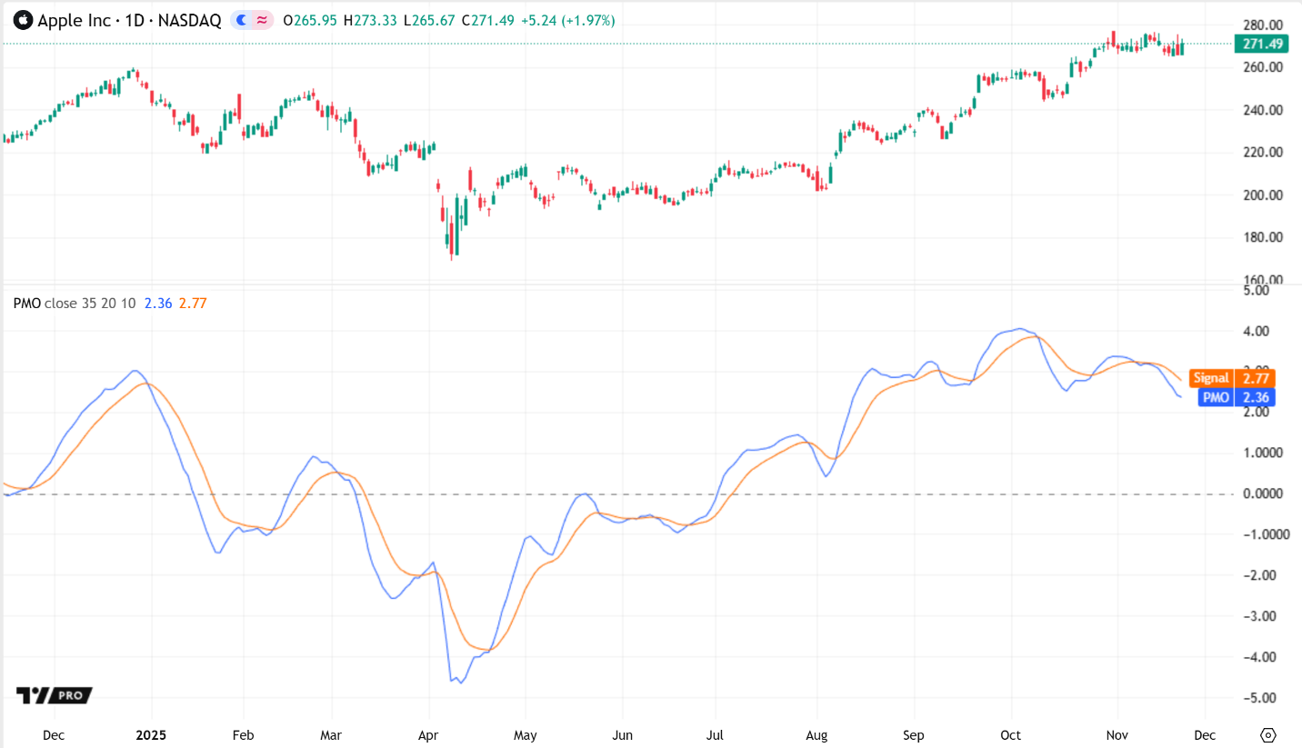 يعد مذبذب زخم السعر (PMO)، الذي ابتكره كارل سوينلين، مؤشرًا للزخم يقيس معدل التغيير السلس عمودًا تلو الآخر (ROC) فيسعر الأداة. يطبق المؤشر مرحلتين من التنعيم على ROC، ويستخدم EMA للنتيجة كخط إشارة.