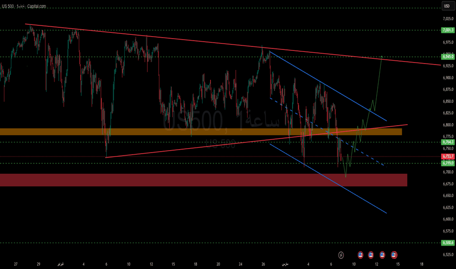 US500 السوق يختبر القاع قبل القرار الكبيرمؤشر US500 يتداول حاليًا قرب 6733 بعد موجة ضغط هابطة واضحة خلال الأيام الأخيرة. الهيكل العام يكشف أن السوق خرج من قناة هبوط قصيرة المدى لكنه لا يزال داخل نطاق صراع بين الطلب والدفع البيعي.