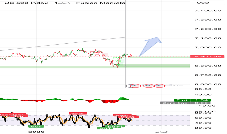 US500 عند نقطة القرار… إمّا ارتداد تقني أو انطلاق مباشر.المؤشر عاد لاختبار منطقة طلب واضحة قرب 6940 – 6935 بعد رفض علوي من نطاق العرض الأعلى.